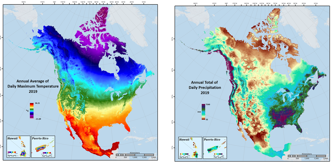 Figure 1. Annual climatologies of 2019 maximum temperature and precipitation derived from Daymet V4 daily data.