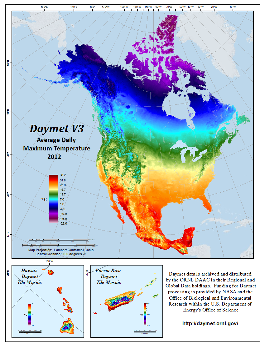 Figure 1. Daymet V3.0 Average Daily Maximum Temperature for North America, Hawaii, and Puerto Rico in the year 2012.